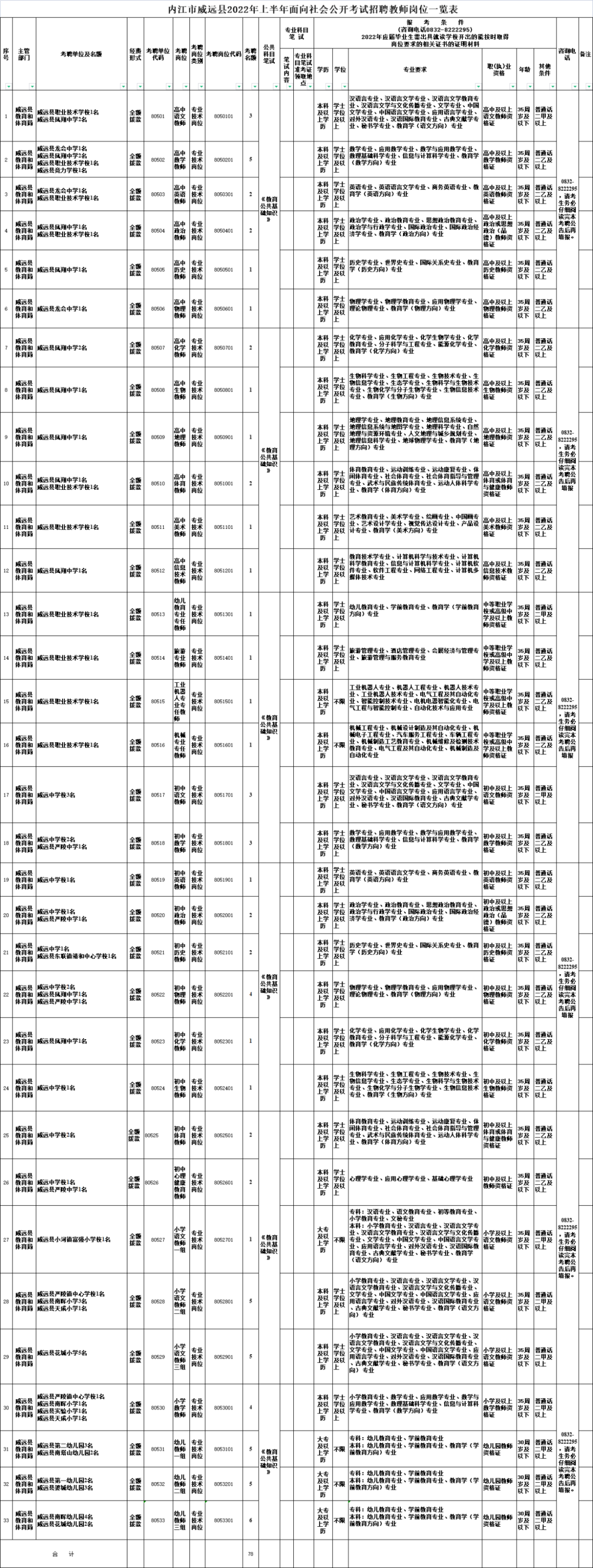 根据《事业单位人事管理条例》、《四川省事业单位工作人员招聘工作试行办法》(川人发〔2006〕9号)、《满冠体育_满冠体育(中国)官方网站进一步规范事业单位公开招聘工作的通知》(川人社发〔2011〕36号)、《事业单位公开招聘违纪违规行为处理规定》(人力资源和社会保障部令第35号) 及《事业单位人事管理回避规定》(人社部规〔2019〕1号)等法规文件规定,按照“公开、平等、竞争、择优”原则,威远县2022年上半年拟面向社会公开考试招聘(以下简称“考聘”)教师78名。现将有关事项公告如下:
