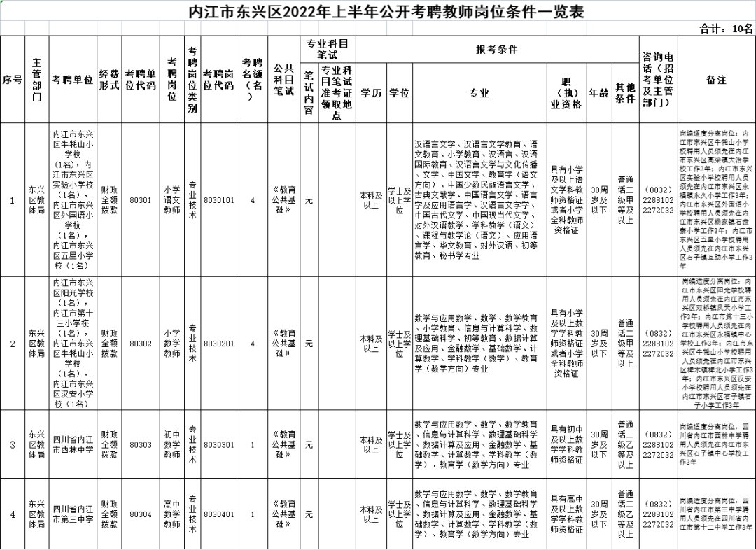 根据《事业单位人事管理条例》、《四川省事业单位工作人员招聘工作试行办法》(川人发〔2006〕9号)、《满冠体育_满冠体育(中国)官方网站进一步规范事业单位公开招聘工作的通知》(川人社发〔2011〕36号)及《事业单位公开招聘违纪违规行为处理规定》(人力资源和社会保障部令第35号)等法规文件规定,按照“公开、平等、竞争、择优”的原则,2022年上半年内江市东兴区将面向社会公开考试招聘教育系统教师10名,现将有关事项集中公告如下: