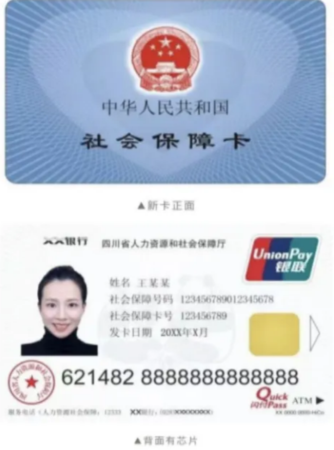 正面:国徽及“中华人民共和国社会保障卡”字样;背面:照片、姓名、社会保障号码、银行卡号、发卡日期、芯片。
