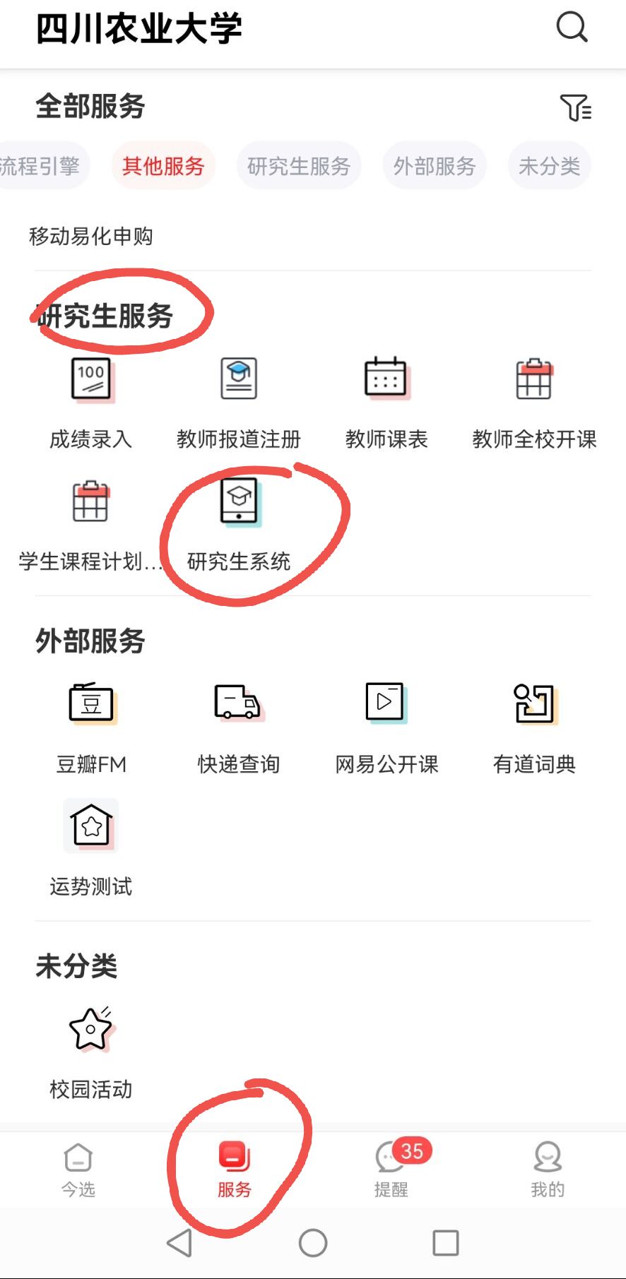 2.手机端:下载安装登录“今日校园”APP,身份绑定后可一键进入,点击“服务”,从“研究生服务”--“研究生系统”--“研工”进入,按需要操作即可。后续还将新增更多相关快捷服务,推荐将常用的服务添加至“我的服务”,更方便快捷。